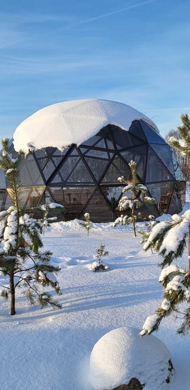 Glamping / poilsio kupolai sodui ar sodybai – elegantiški kupolai, suteikiantys prabangios poilsio zonos įspūdį.
